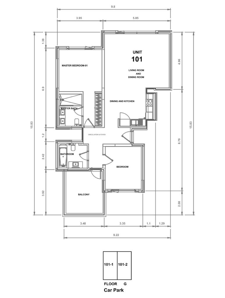 Unit 101 offers 2 bedrooms and an open living hall with kitchen, with an indoor living area of 99.97 sqm.