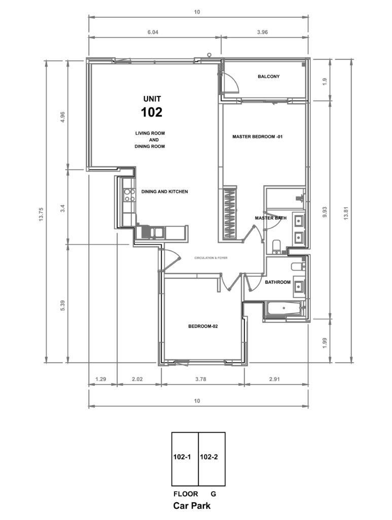 • 102 First Floor, with 2 Bedrooms and 1 Living room &  1 Kitchen.