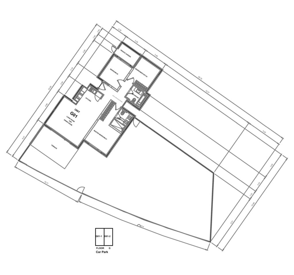 Unit G01 offers 3 bedrooms and an open living hall with kitchen, with an indoor living area of 113.57 sqm.